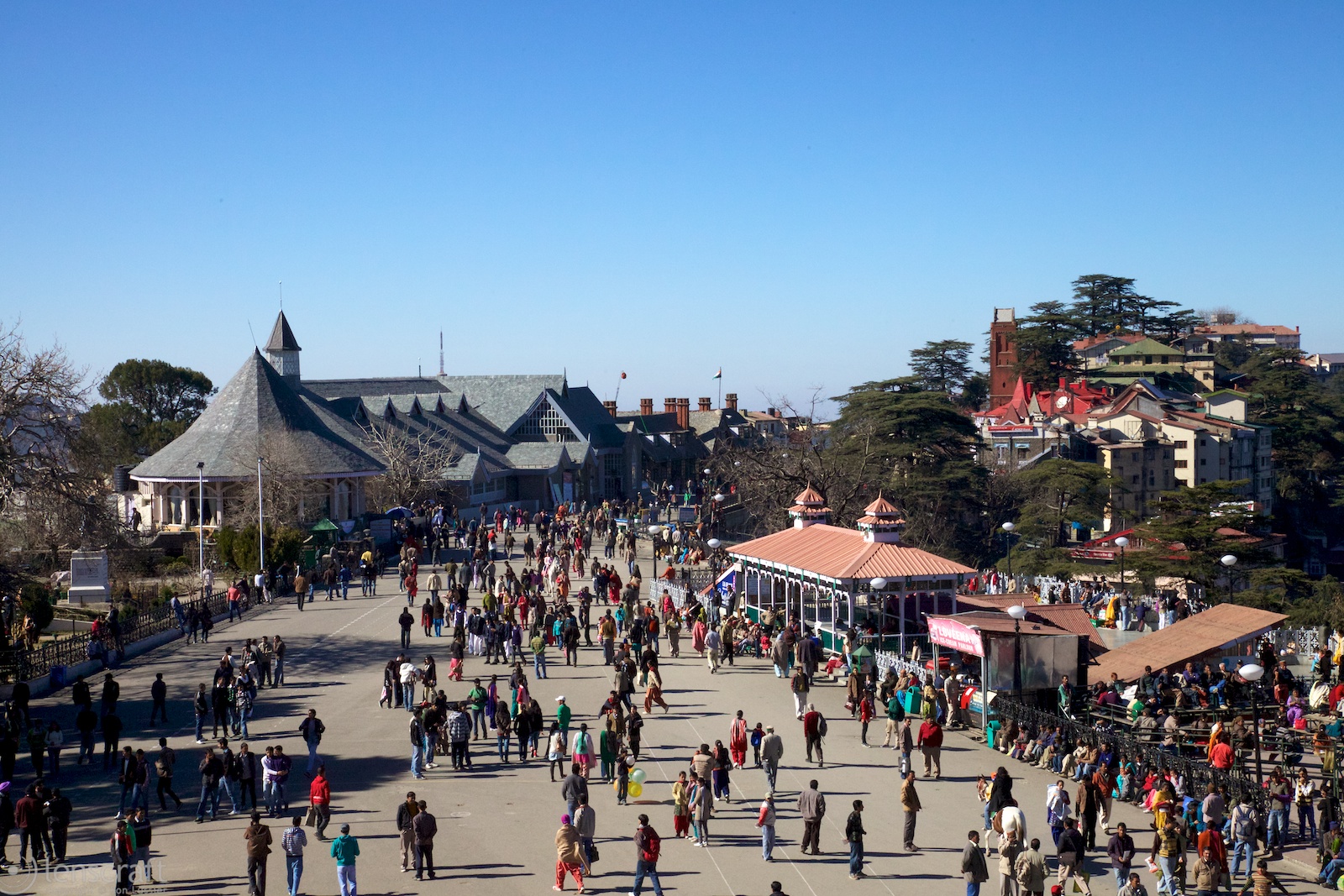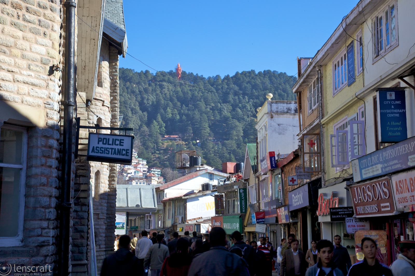 After that, I’m on my own, and I go walking. The main square of Shimla is called Scandal Point, and it sits smack on the ridge. From either side you can look far down into the valleys. Looking north, a jagged line of snowy peaks is clearly visible in the distance. The square is full of people strolling, taking pony rides, or simply sitting on a bench and enjoying the sun.